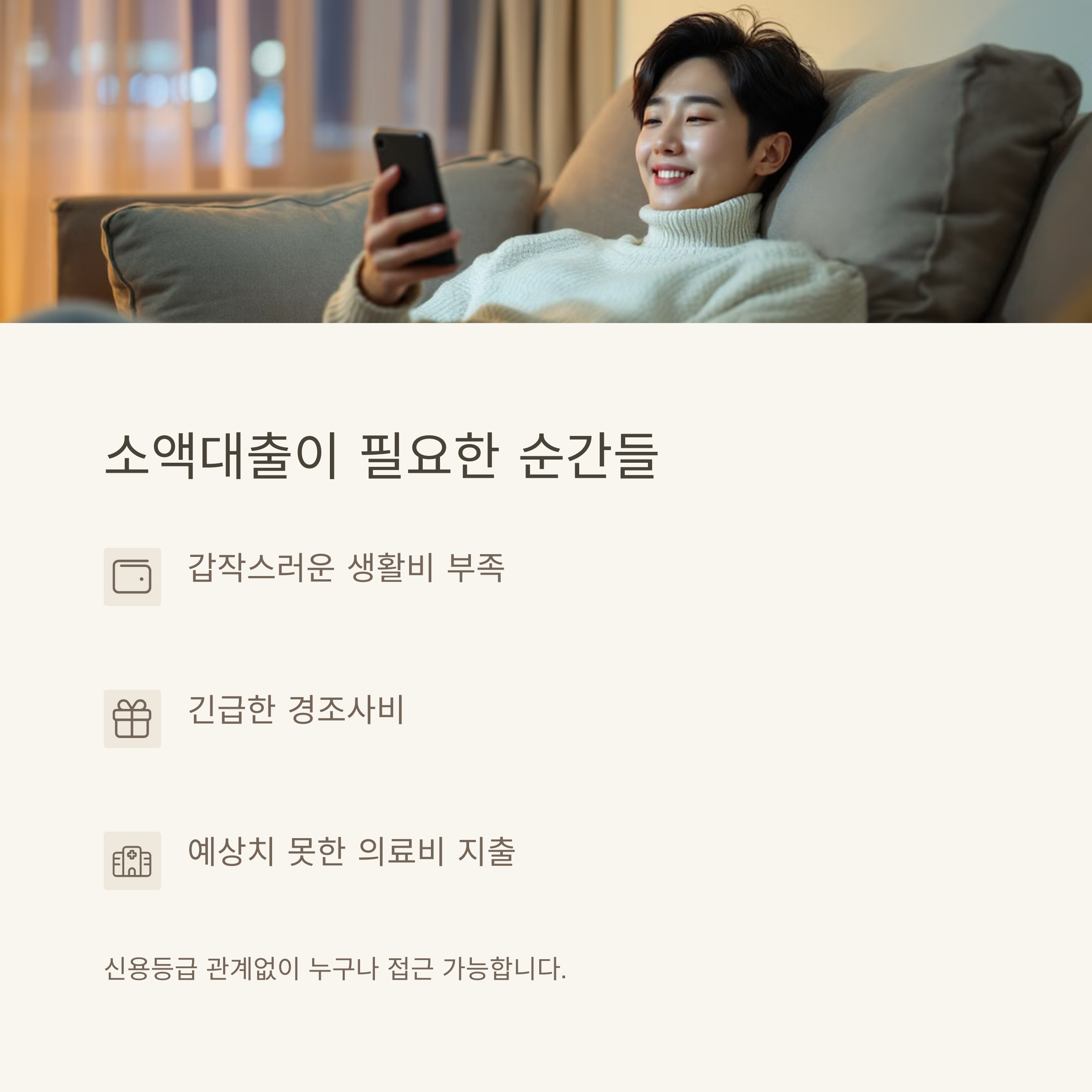 생활비가 부족하거나, 급한 경조사비, 병원비 등 갑작스러운 지출이 생길 때 소액대출 100만원은 큰 도움이 되죠. 특히 무직자나 신용등급이 낮은 분들도 접근 가능한 상품이 많아졌어요.