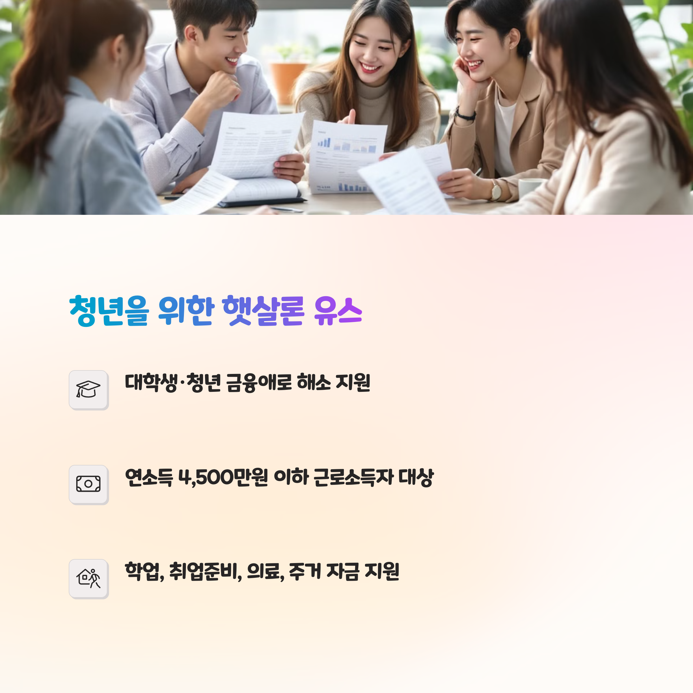 - 햇살론유스: 취업 준비생이나 사회초년생 청년을 위해 설계됐어요. 거치기간이 길어 상환 부담이 적고, 교육비·생활비 등 다양한 용도로 사용할 수 있죠.