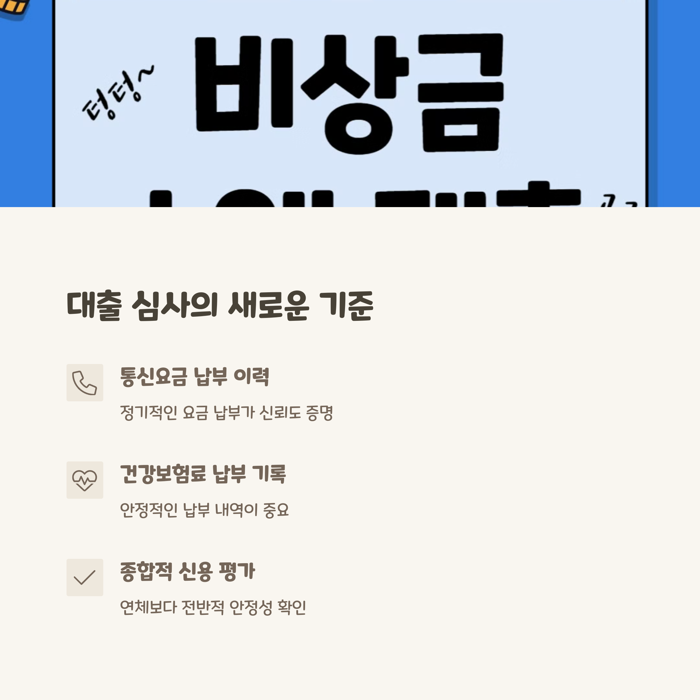 - 비금융 정보: 건강보험료 납부 실적, 공공요금 납부 내역, 신용카드 사용 이력 등이 심사에 반영됩니다. 꾸준한 납부가 중요해요.
