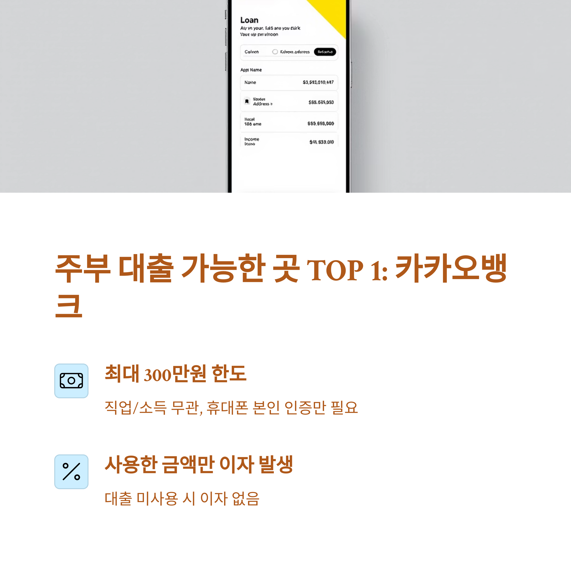 예를 들어, 카카오뱅크 비상금대출은 소득 증빙 없이 신용등급만으로 최대 300만 원까지 대출이 가능합니다. 이런 상품들은 주부 대출 가능한 곳으로 인기가 많아요.