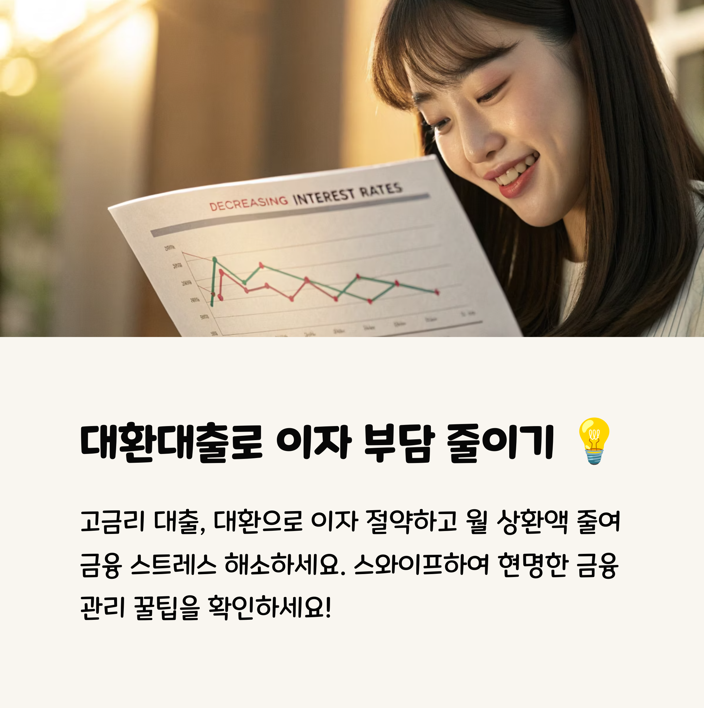 신용점수 관리와 소득증빙 서류를 철저히 준비한 후 대환대출을 신청해 평균 금리 8%로 낮출 수 있었고, 월 이자 부담이 약 33만원으로 줄었습니다.