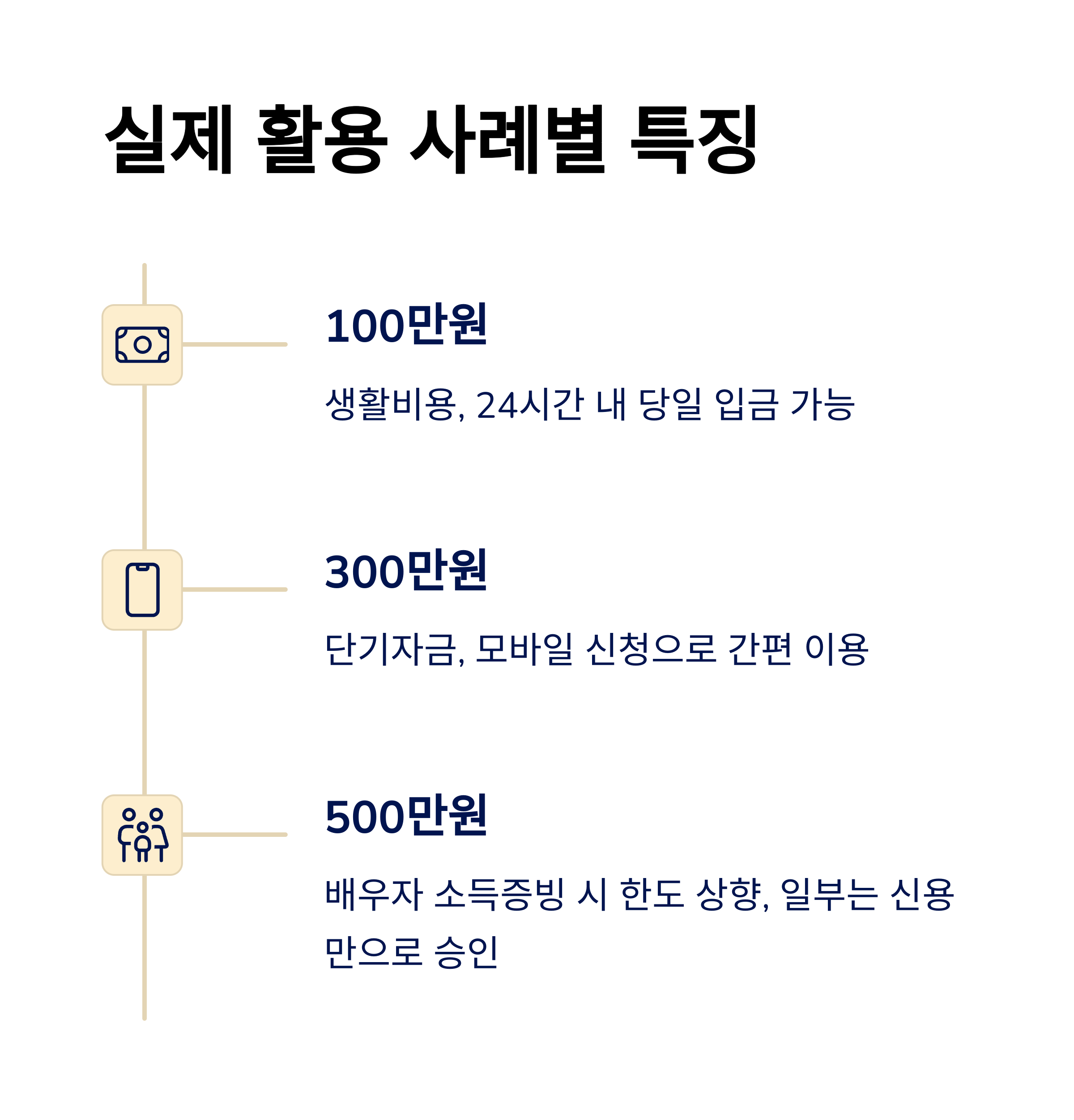 | 카카오뱅크 | 비상금 대출 | 최대 300만원 | 연 6.0~14.5% | 앱 내 5분 이내 승인 |
