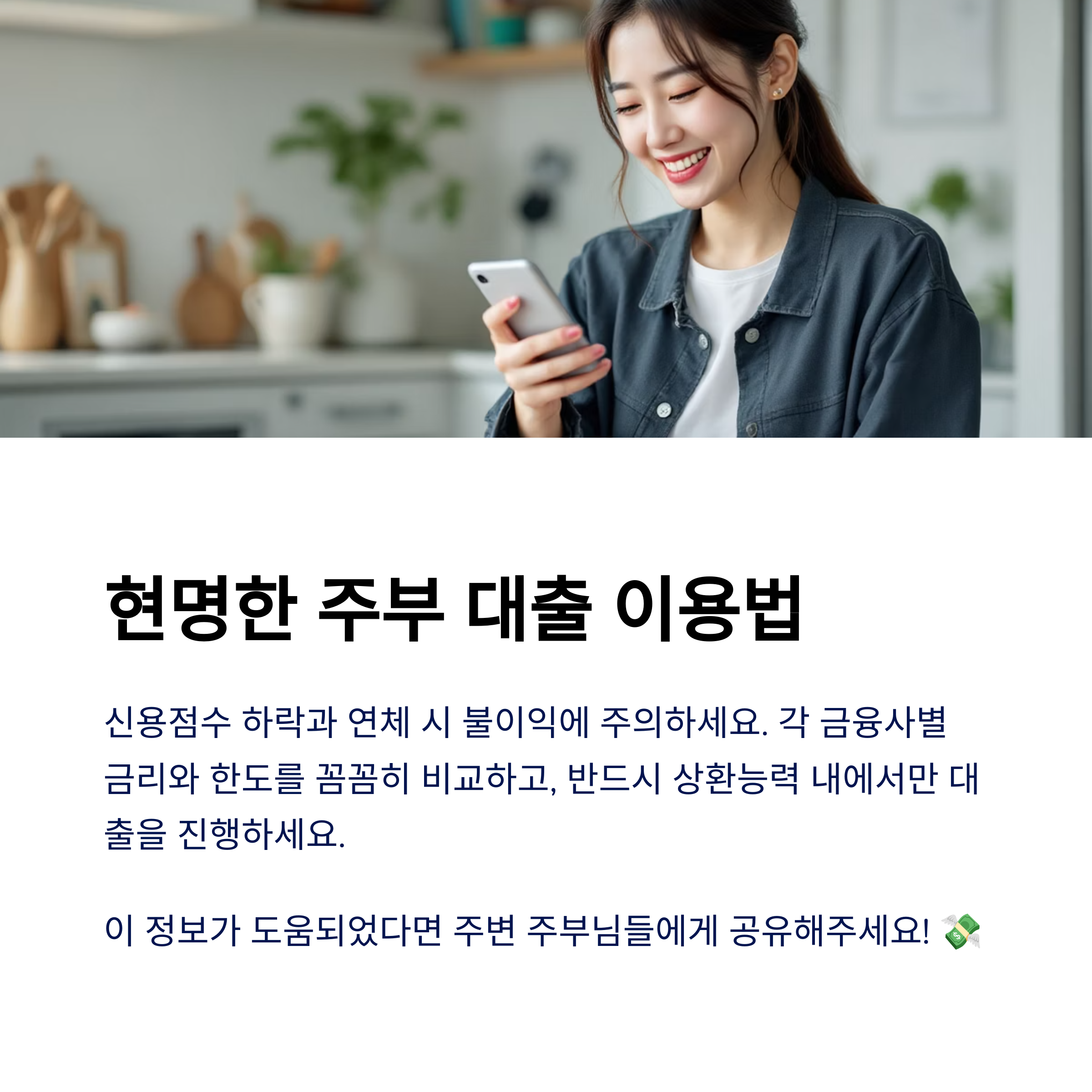 여러 금융기관의 상품을 비교하고, 본인의 상환 능력을 고려하여 적절한 대출 상품을 선택하시길 바랍니다. 특히 금리와 상환 조건을 꼼꼼히 확인하고, 불법 대출에 주의하세요. 현명한 금융 의사결정으로 가정 경제에 도움이 되는 선택을 하시기 바랍니다. 😊