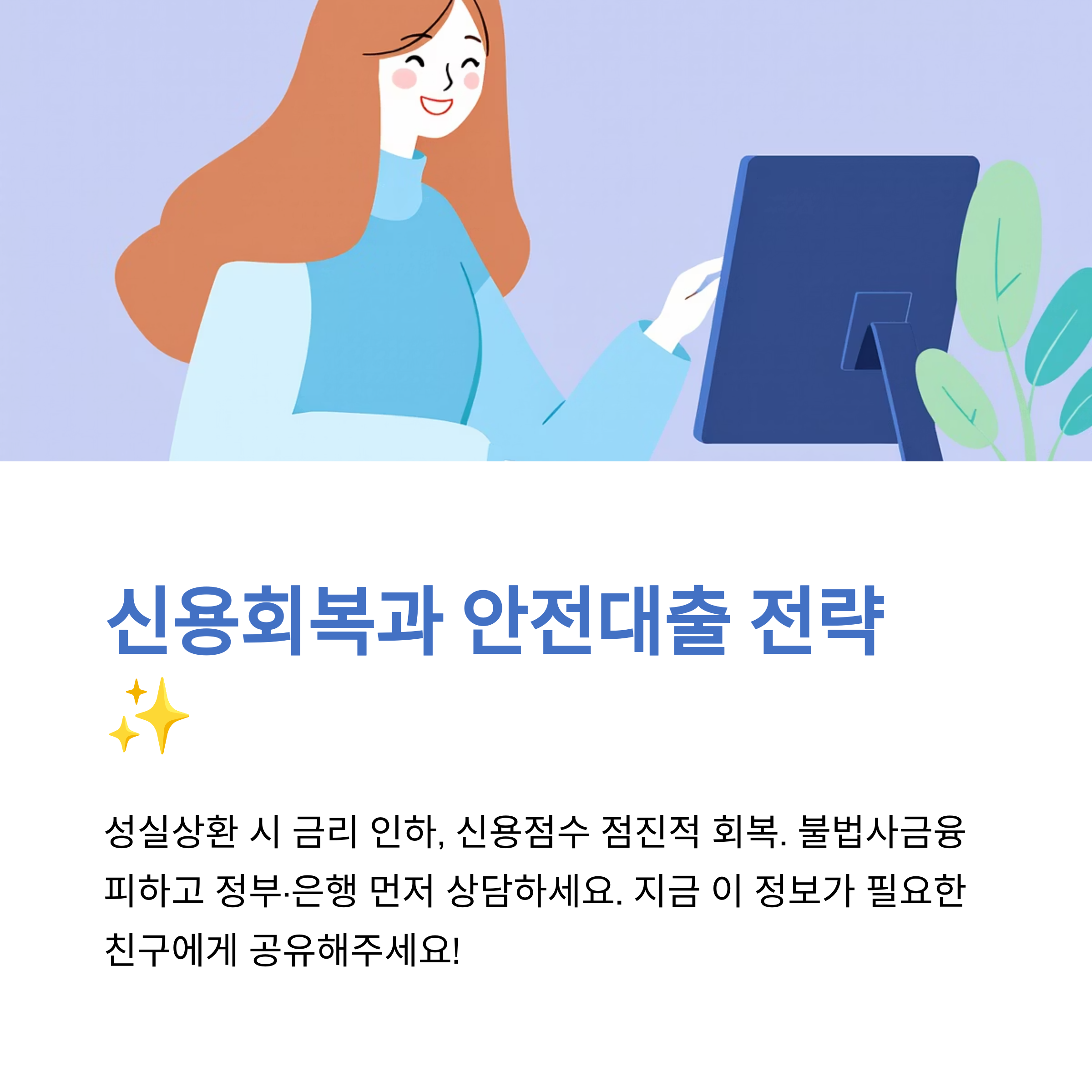 금융 전문가들도 강조하듯, 신용점수는 단기간에 극적으로 개선되기 어렵습니다. 하지만 꾸준한 관리와 올바른 금융 습관 형성을 통해 6개월~1년 내에 충분히 개선할 수 있으니 포기하지 마세요. 여러분의 금융 건강이 회복되어 더 나은 조건의 대출 상품을 이용할 수 있는 날이 반드시 올 것입니다.