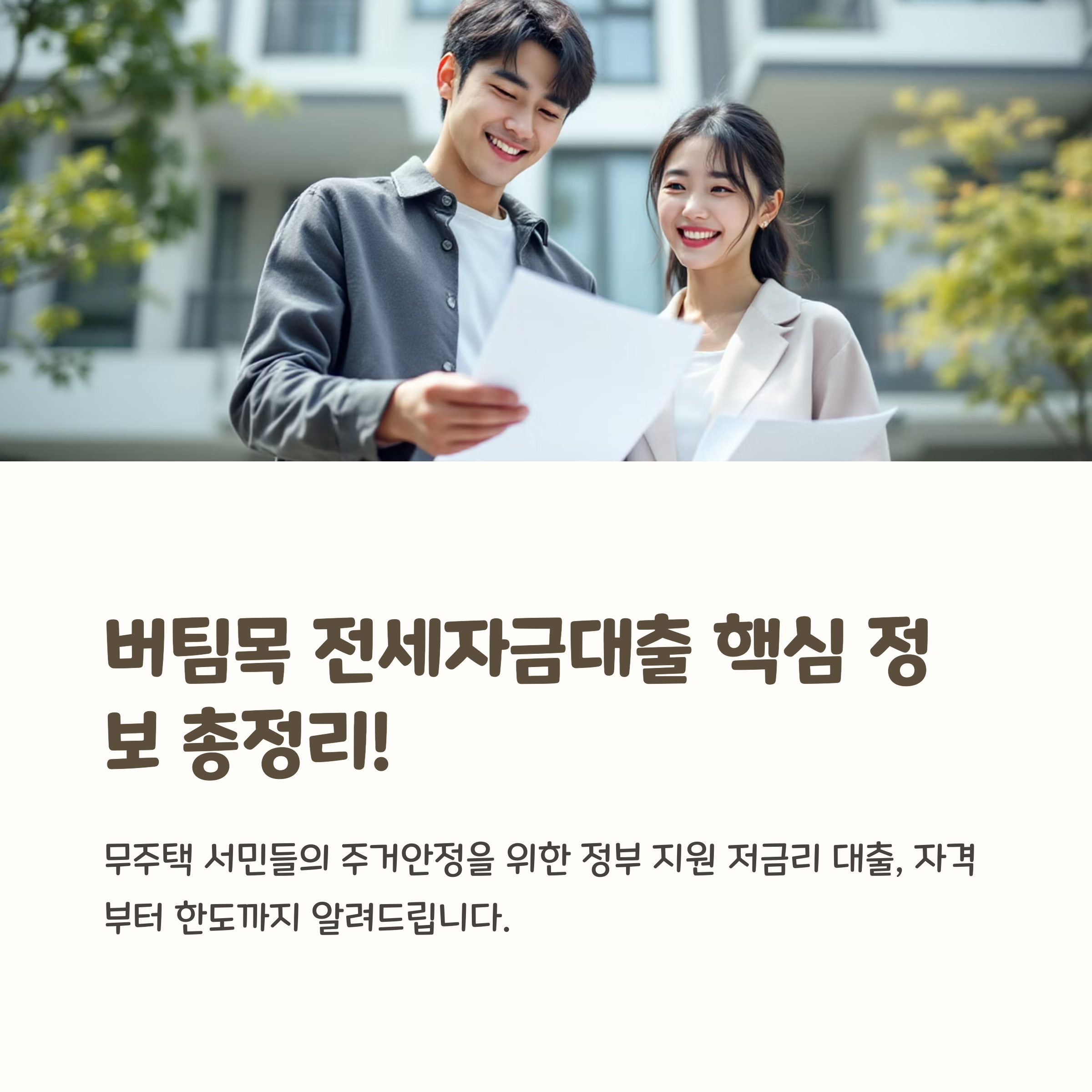 안녕하세요! 내 집 마련의 첫걸음, 바로 전세 계약입니다. 하지만 만만치 않은 전세보증금 때문에 많은 분들이 어려움을 겪곤 하죠. 이러한 부담을 덜어드리기 위해 정부에서 지원하는 든든한 금융 상품, 바로 '버팀목 전세자금대출'입니다.