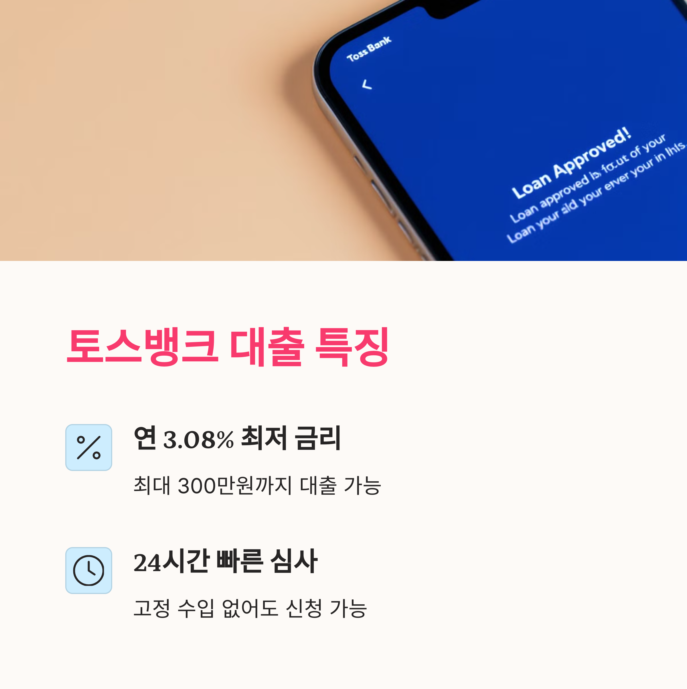 | 토스뱅크 비상금대출 | 300만 원 | 연 3.08%~ | 소득 증빙 불필요 |
