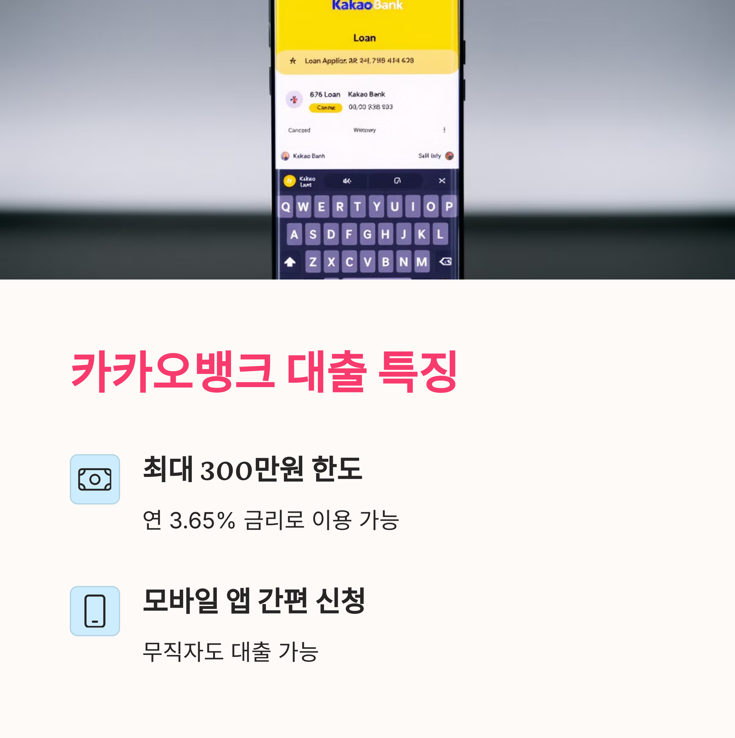 | 카카오뱅크 비상금대출 | 300만 원 | 연 3.65%~ | 무직자 OK, 24시간 신청 |
