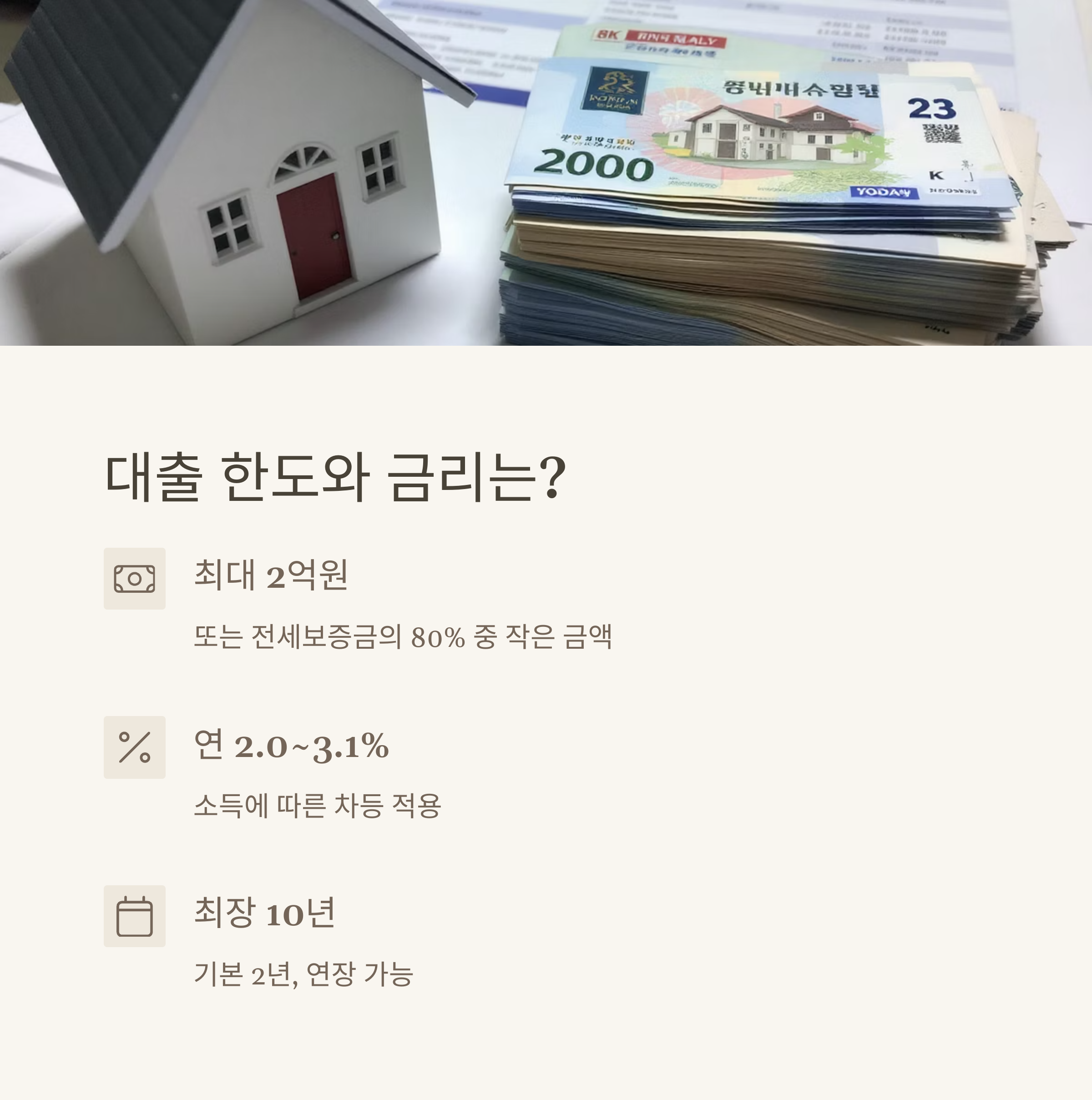 - 청년 전용 버팀목 전세자금: 최대 2억원 (수도권 기준, 지방 1억 5천만원)