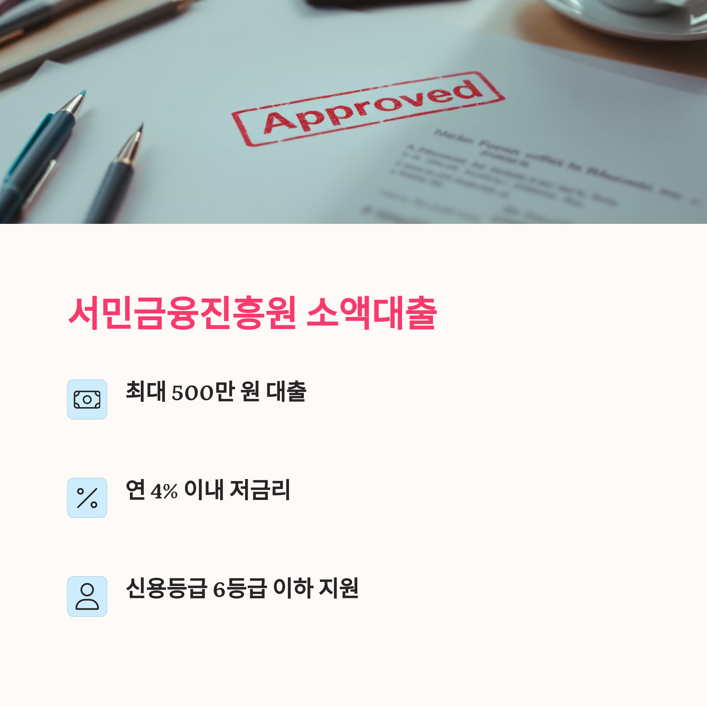 | 신용회복위원회 소액대출 | 500만 원 | 연 4% 이내 | 채무조정 6개월 이상 성실 상환 |