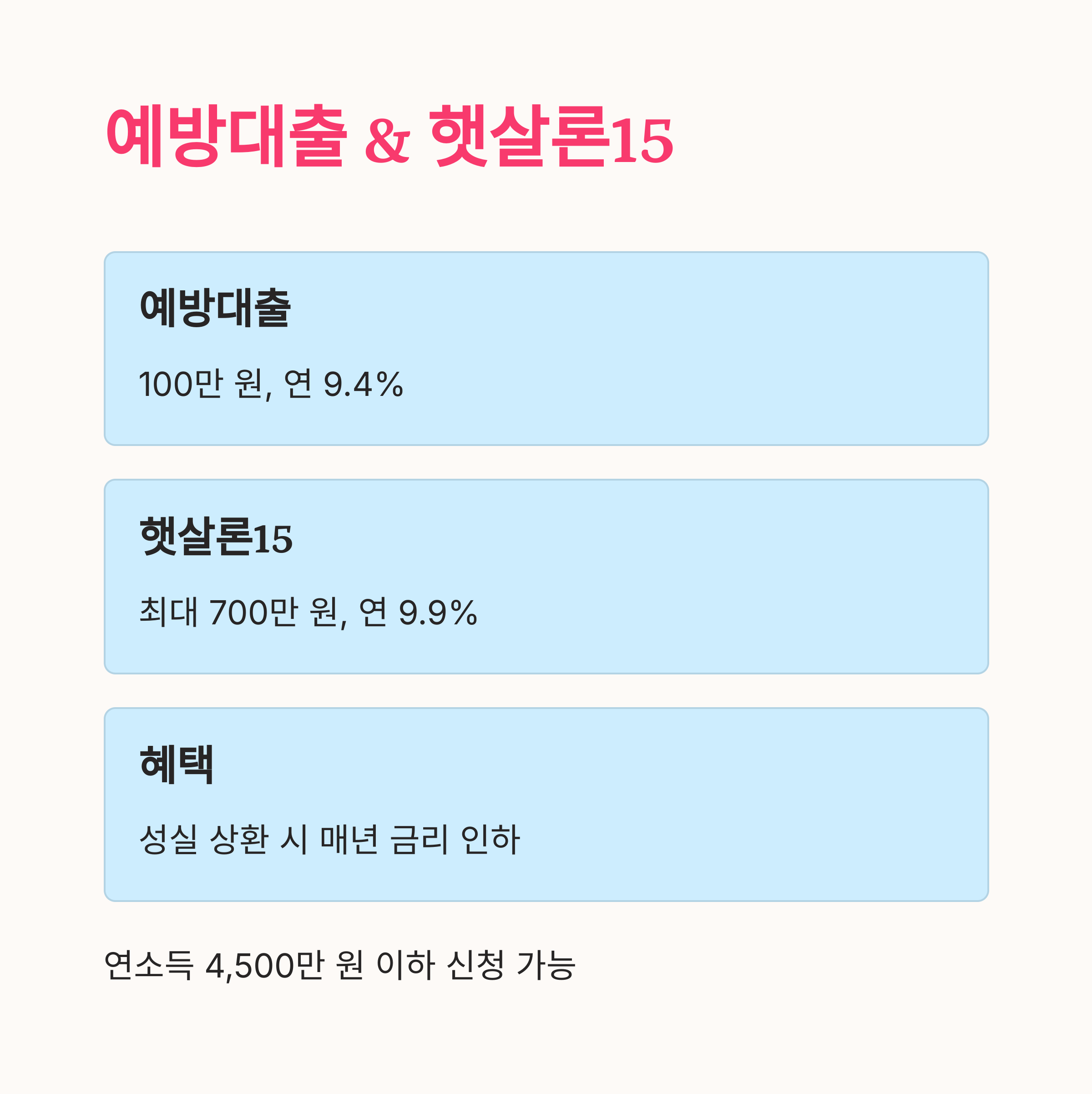 | 햇살론15 | 700만 원 | 연 15.9% (최저 9.9%) | 신용 하위 20%, 연소득 4,500만 원 이하 |