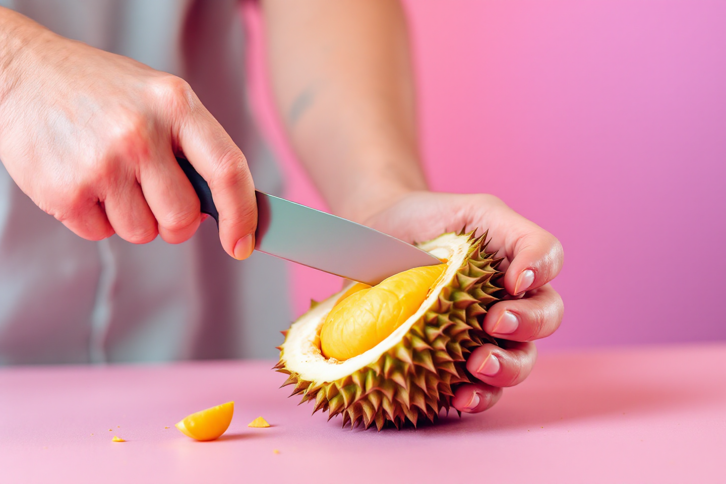 두리안의 단단한 가시 껍질은 맨손으로 다루기 어려워요. 두리안 먹는 법의 첫걸음은 안전하게 까는 것! 껍질에 자연스럽게 갈라진 틈(보통 5갈래)을 찾아 칼이나 장갑을 낀 손으로 벌려보세요. 잘 안 벌어진다면 칼로 틈을 따라 살짝 자르면 쉽게 열립니다. 과육은 숟가락으로 떠먹거나 손으로 꺼내 먹으면 돼요.